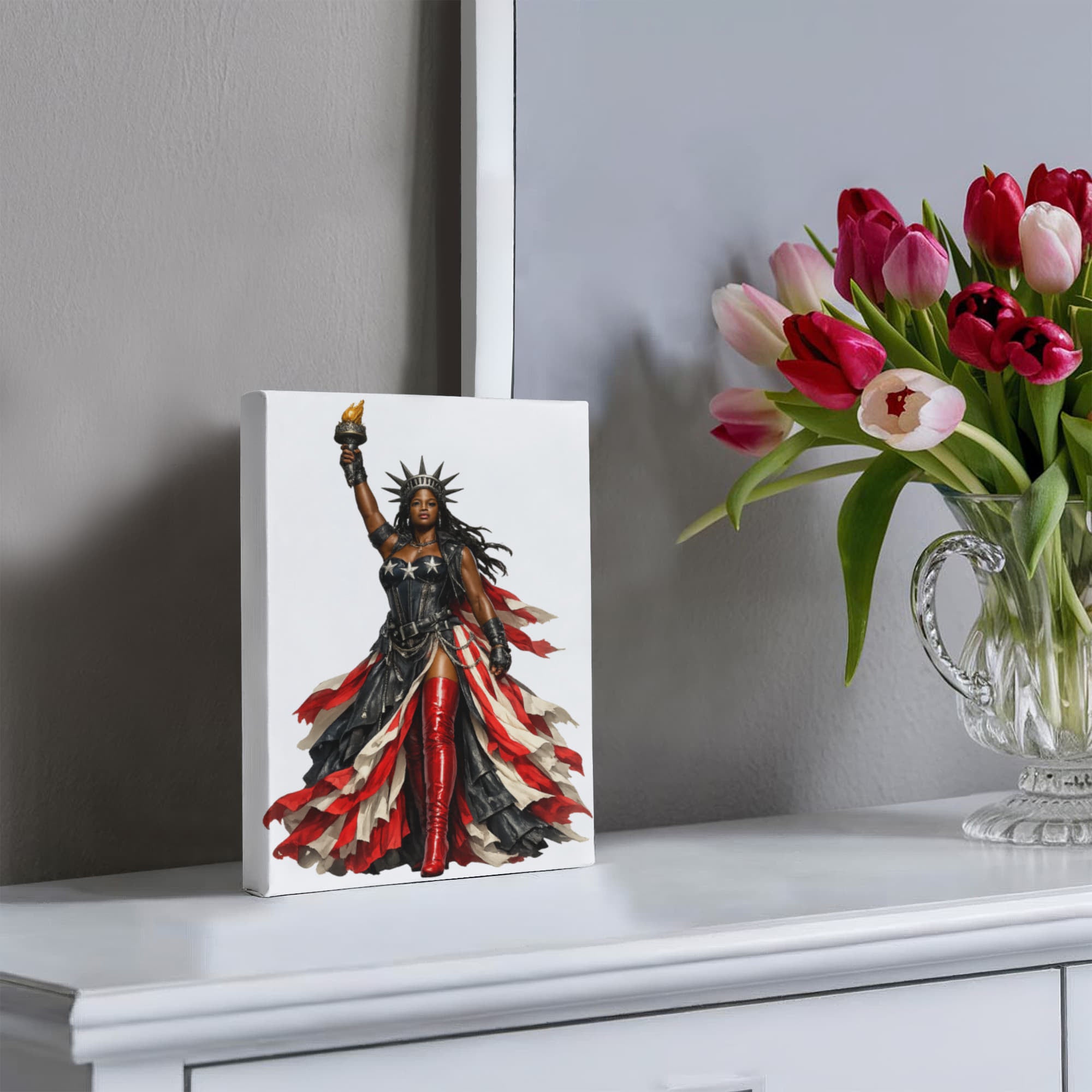 Our Gallery Wrapped Canvas adds a unique touch to any room with vibrant, high-pigment designs on premium material. Perfect for home or professional spaces, it’s a thoughtful gift for any special occasion.  For a beautiful iconic and captivating woman you can't go wrong with Miss Americana Collection's fashion statement and salute to liberty.